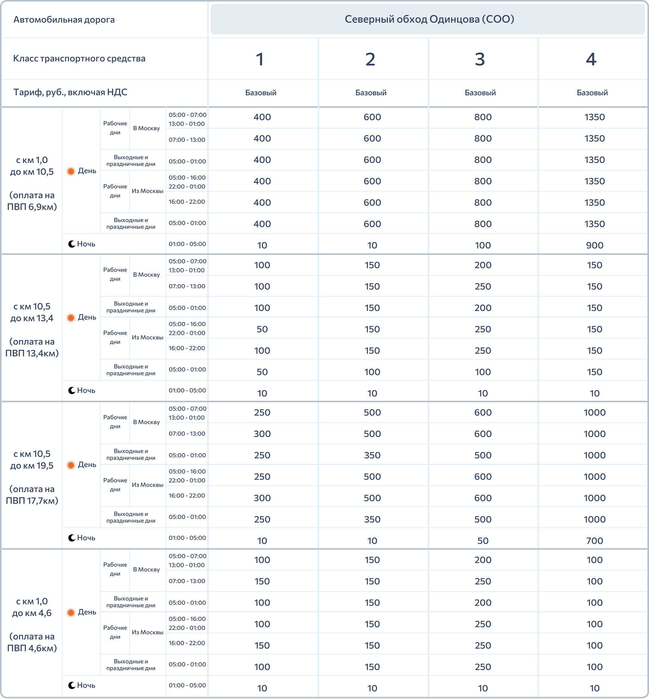 Информируем Вас о том, что с 15 января 2026 года устанавливаются следующие базовые тарифы на проезд по Северному обходу Одинцова: