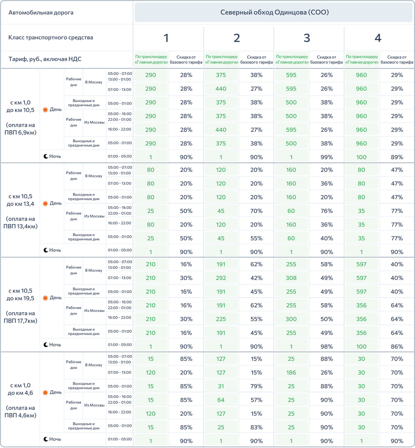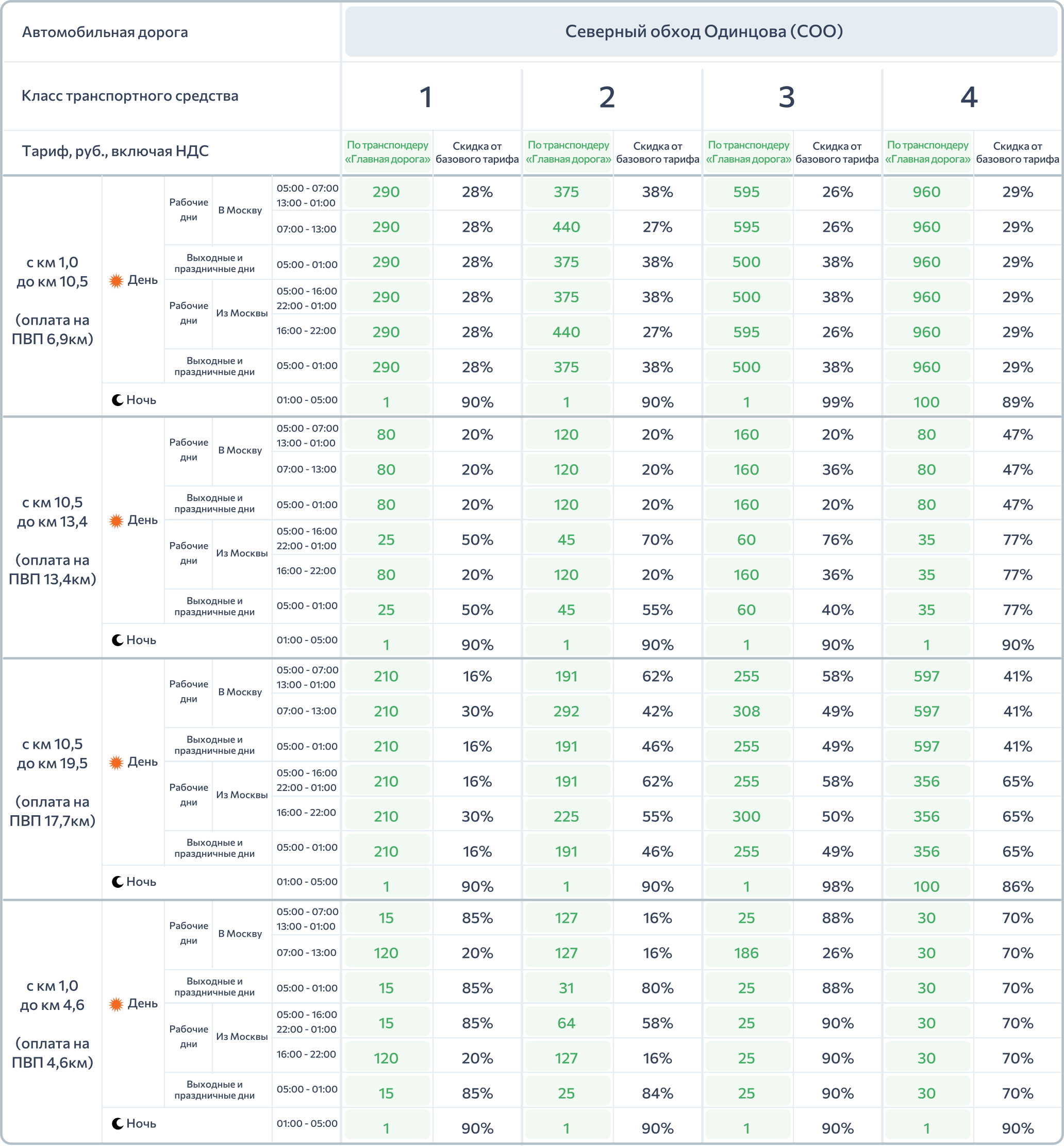 При использовании транспондера «Главная Дорога» действуют условия акционной программы скидок*. Значения тарифов и скидки от базового тарифа представлены в таблице: