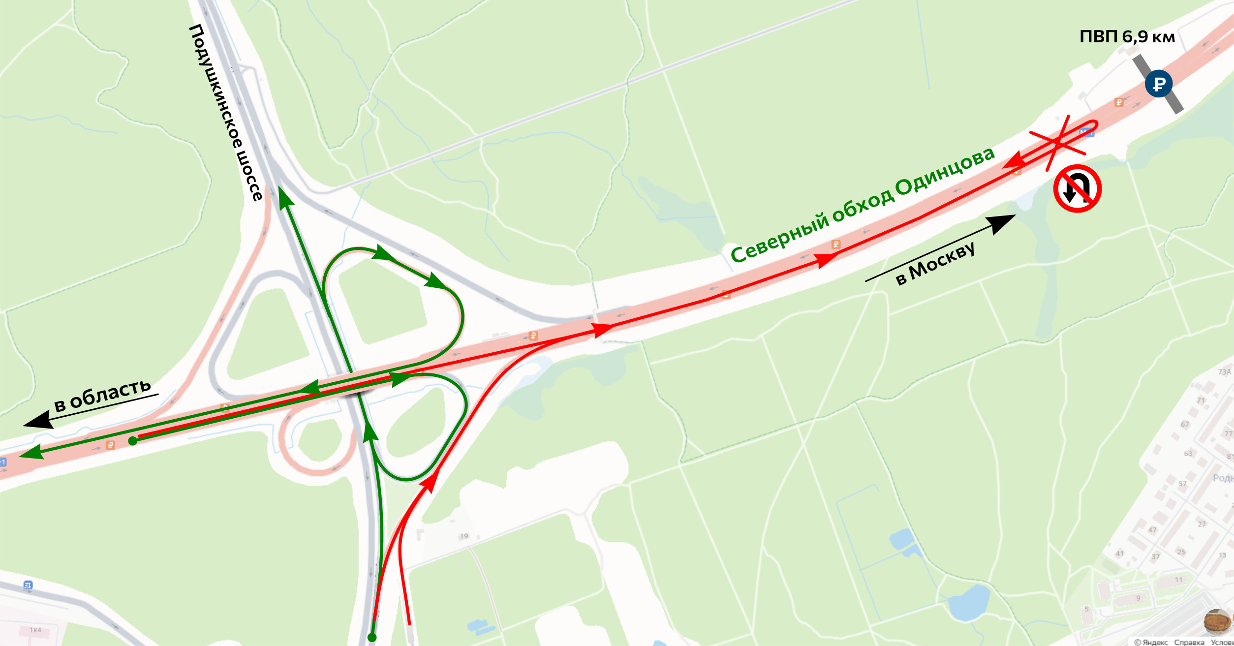 Для разворота рекомендуем использовать транспортную развязку на пересечении платной дороги с Подушкинским шоссе.